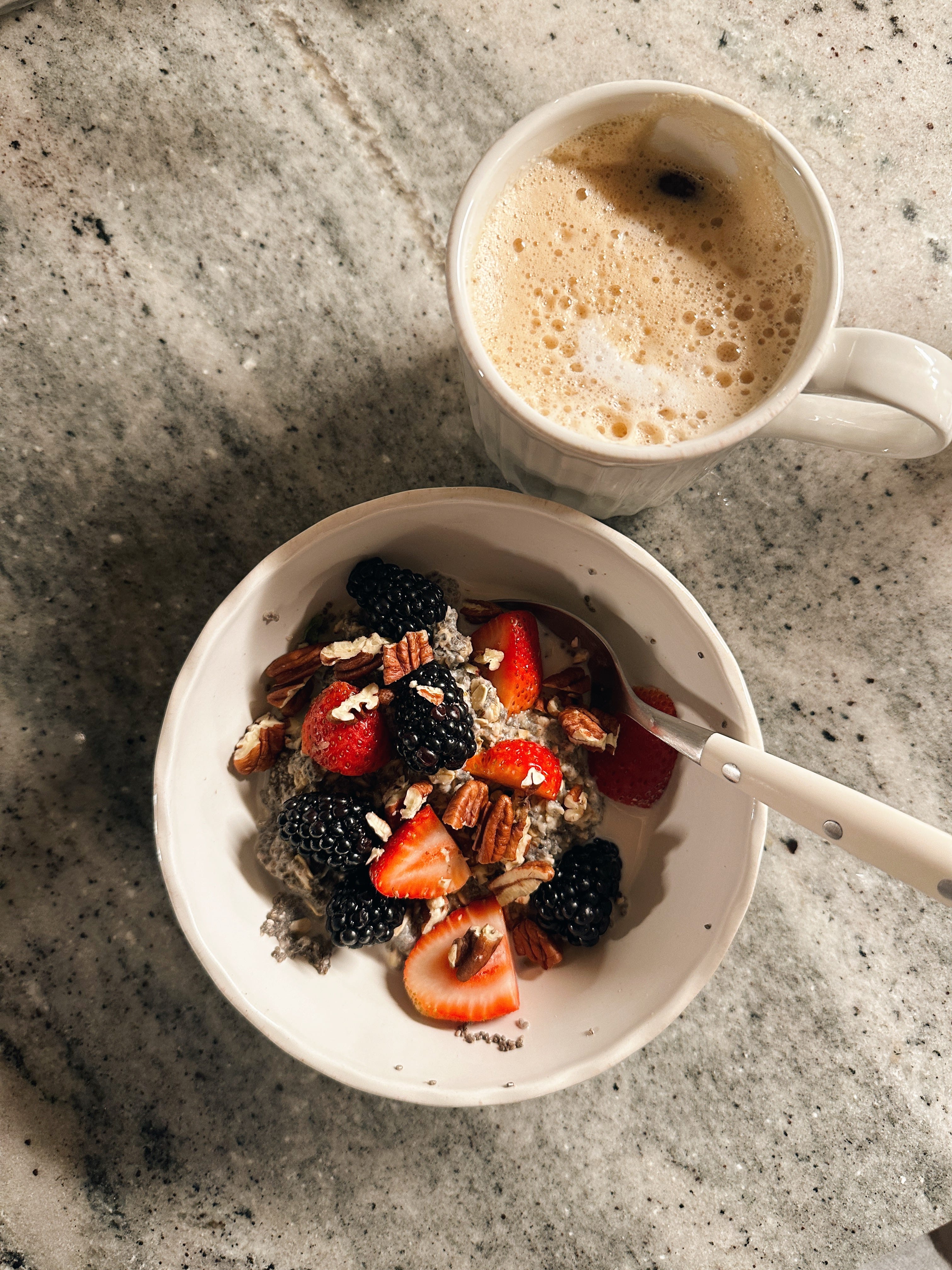Combine 1/4 cup chia seeds, 1/4 cup organic rolled oats, 3/4 - 1 cup milk of choice in a bowl and microwave for about 2 minutes. Next, it’s time for toppings (which are non-negotiable for some flavor here). Good picks: cinnamon or pumpkin pie spice, maple syrup, berries or frozen fruit (add the fruit before microwaving if frozen), nuts / nut butter, seeds, plain Greek yogurt, unsweetened shredded coconut, cacao nibs, etc etc etc. You can also stir protein powder into the combo prior to heating up. The below combo, topped with maple, berries, and pecans, delivers a whopping 20(!!!) grams of dietary fiber. That’s about 2/3 of my goal for the day.